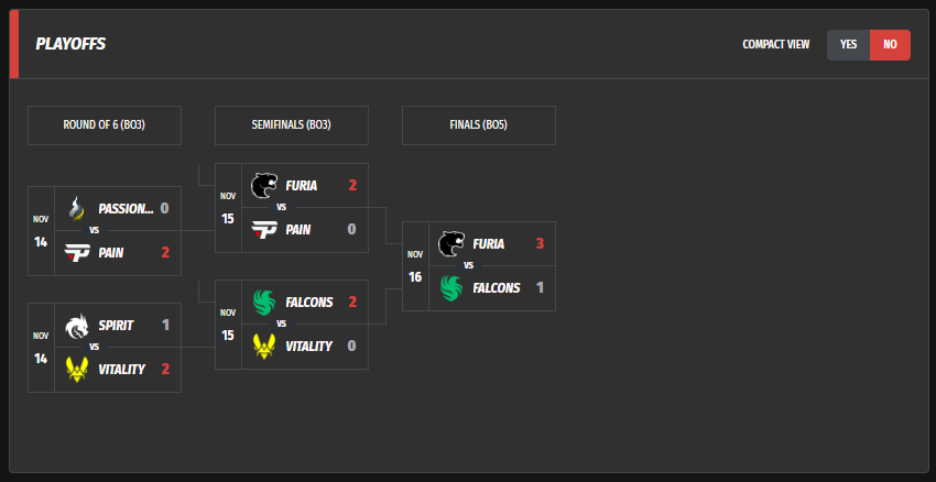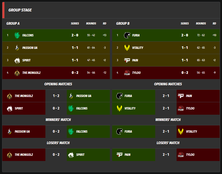 Group stage: FURIA dominated Group B, taking first place with a clean score of 2-0, surpassing formidable opponents such as Vitality and paiN Gaming.