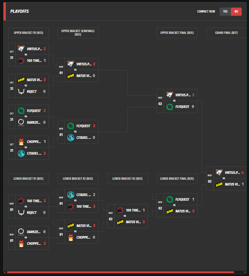 In the playoffs, the team successively defeated 100 Thieves in the quarterfinals and Natus Vincere in the upper bracket semifinals. In the upper bracket final, Virtus.pro faced FlyQuest and secured a victory, ensuring their place in the grand final. In the decisive match, Virtus.pro once again proved stronger than Natus Vincere.